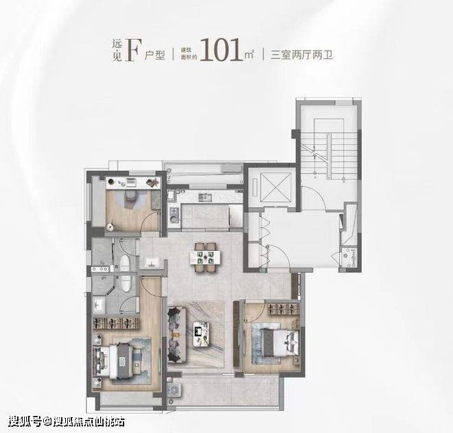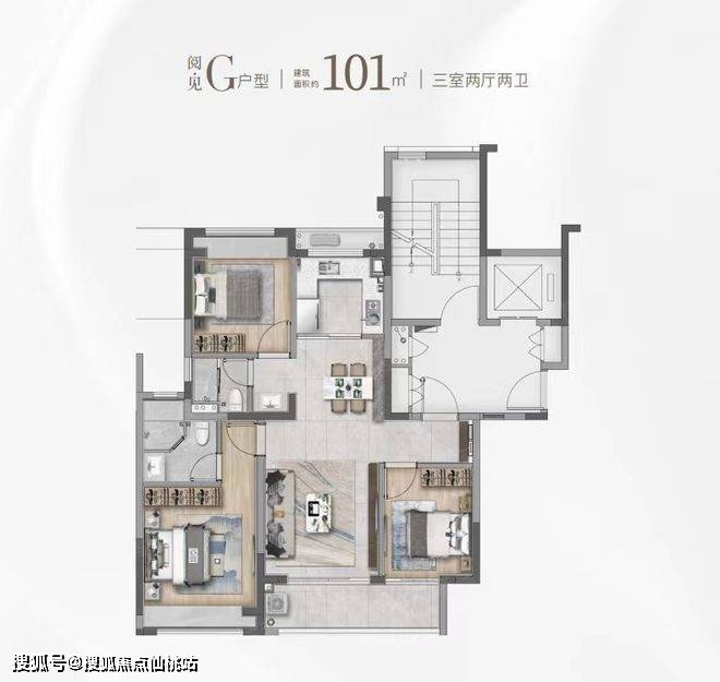 同样是3房2卫的配置,功能性与舒适度兼具。该户型惊艳的地方在于大尺度的景观边厅设计,搭配超大阳台,营造IMAX级别的客厅景观面,极具阔绰感!